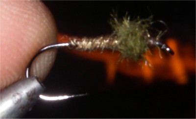 Slightly out of focus - it's difficult taking great pictures like this around a campfire, but it's just another of those skills you need if you want to be Mr Sexyloops. Anyway this is a Cove PT, developed by Arthur Cove back in the days when nobody did this shit - on reservoirs at least. It's a great fly... I also use it on rivers. erm, there's fish rising.....