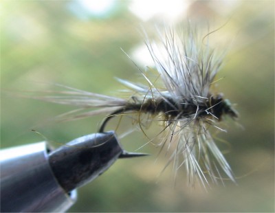 Heavily hackled riffle dun - this one is actually in focus and really looks like this - try squinting and you'll see what I mean, it's very clever
