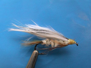 size 10 long shank, white thread, tail and throat of olive, orange and grizzle hackles (I think the original is teal, if not teal then mallard - do I care?), white chenille body with silver rib, white marabou wing with squirrel overwing. If you inadvertently tie the fat head like mine, paint eyes and pretend it was intentional.