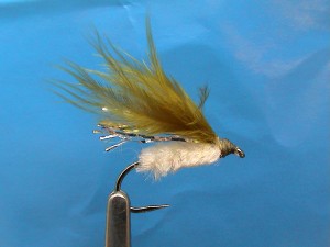 Tying instructions:size 10 - olive thread, white chenille body, silver flash-a-something underwing, olive marabou wing.