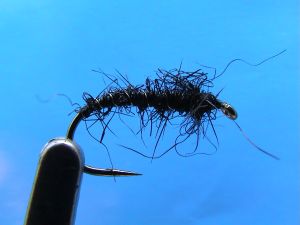 What a great fly to start with, as you can see this section's going to be great; definitely the best yet. It looks like I know what I'm doing (for once) and the flytying is superb. This is a black buzzer. It's tied with seal's fur (road kill of course) and it does very well for me in April. You can get some pretty big buzzers hatching in April and this should be tied in a 12 or even a 10.