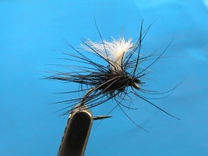 black thread, black seal, white poly wing, black parachute hackle.