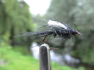 size 12 hook - black tail, black body, a rib of some sort, some more black, some white stuff which we'll call the wing and then more black stuff. Pretty technical, but I can go there.