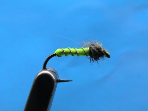 Tying instructions:size 16, bright green floss, copper rib, mole thorax.