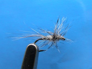 size 18 hook, grey thread, grizzle tails, angel dubbing, grizzle hackle.
