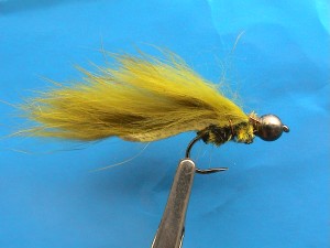 size 8, olive chenille, natural olive bunny, copper wire matuka, tungsten bead.