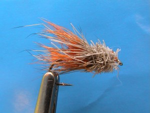 size 10, brown thread, hot orange seal, orange palmered cock, gold wire/mono rib, muddler head with some fibres sticking backwards in an enticing manner (don't clip these ones; use your fingers for that just-got-out-of-bed effect that all men and fish love)