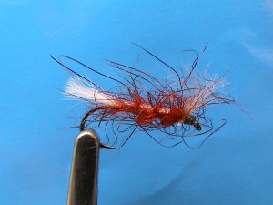 size 12, brown or olive thread, brick seal, pearl lurex rib, white poly yarn breathers tied along the shank.