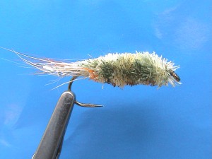 size 10 long shank - olive thread, silver and orange cock with flash-a-something tail, white spun deer hair pantoned on one half only (stunned fry float side-saddle).