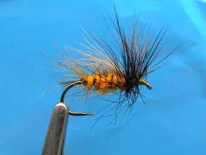 size 8, olive thread, yellow seal ribbed through with black seal on a dubbing loop, reverse rib with mono, light blue dun wing, black hackle.